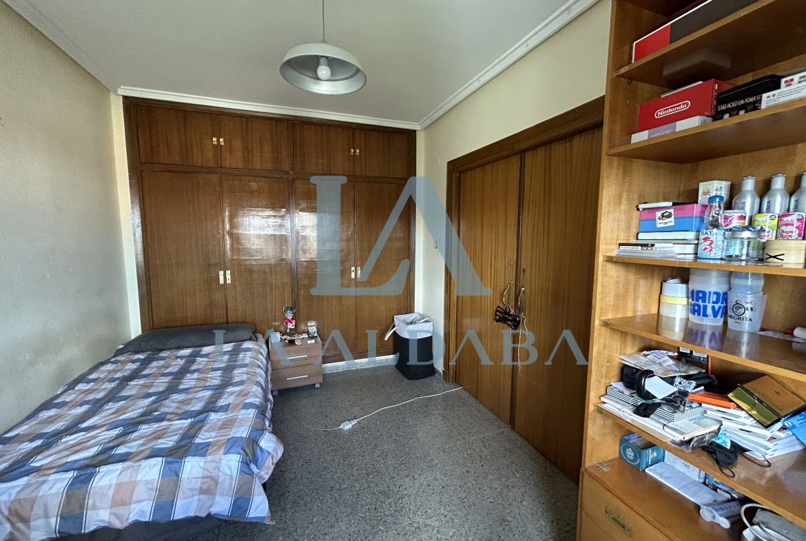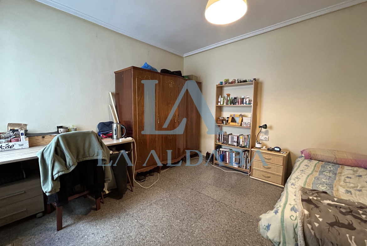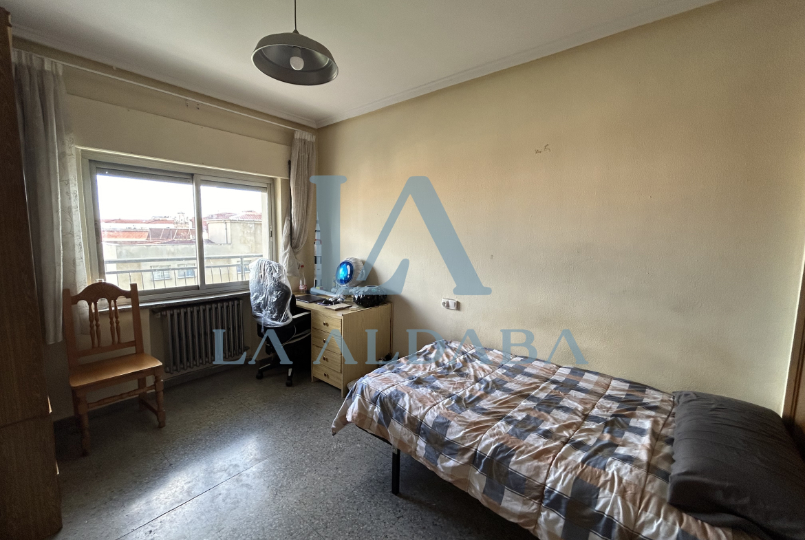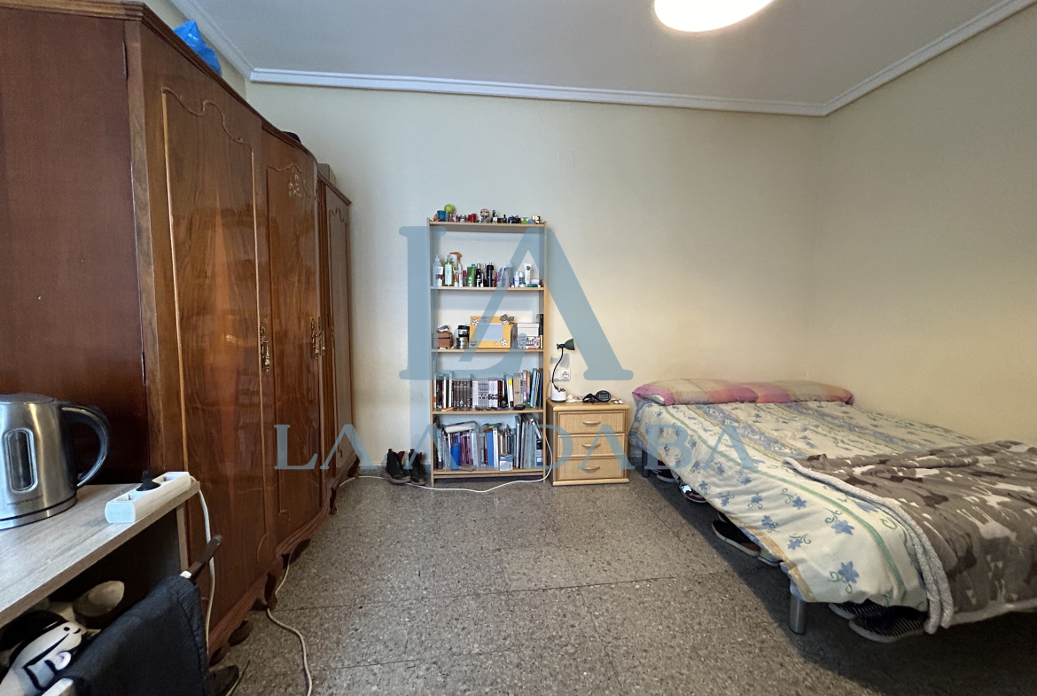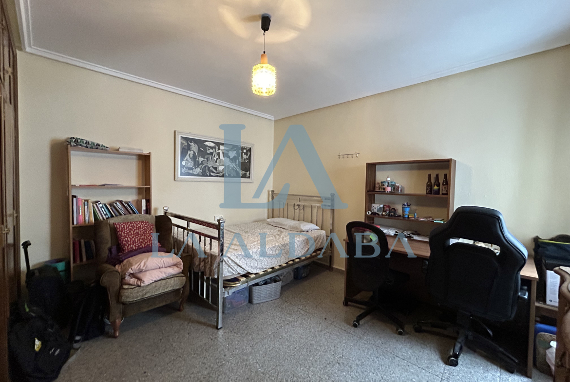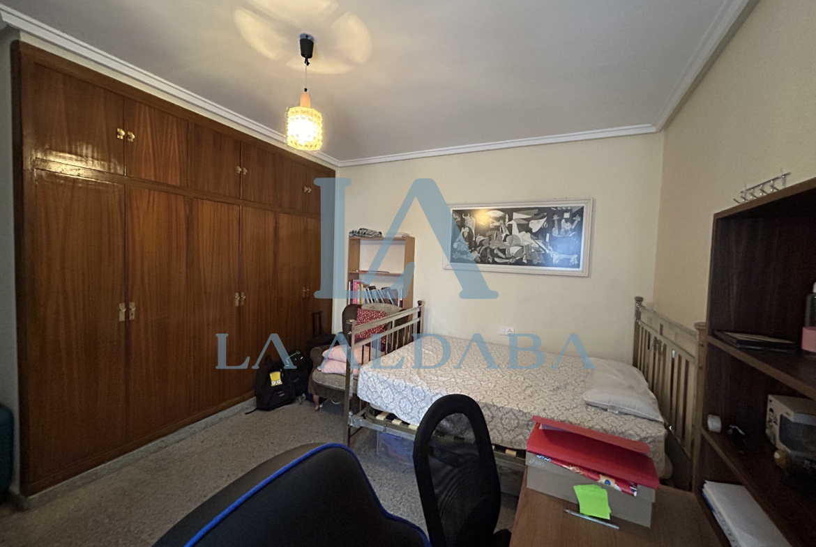 La segunda habitación tiene 15 m2, una cama, un armario de 4 cuerpos, una mesilla, una estantería y una gran mesa de escritorio.