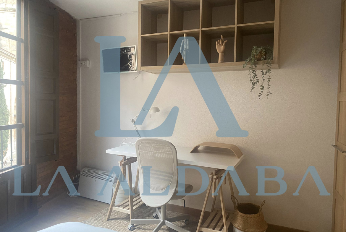 Completamente exterior, la vivienda está situada justo en frente de La Clerecía, en pleno centro de la ciudad a 10 metros de la Universidad Pontificia, a 2 minutos de la Plaza Mayor. Todas las habitaciones tienen luz natural y hay calefacción en todas las habitaciones, baños y cocina. Tiene 120 m2 construidos y 3 plantas:
