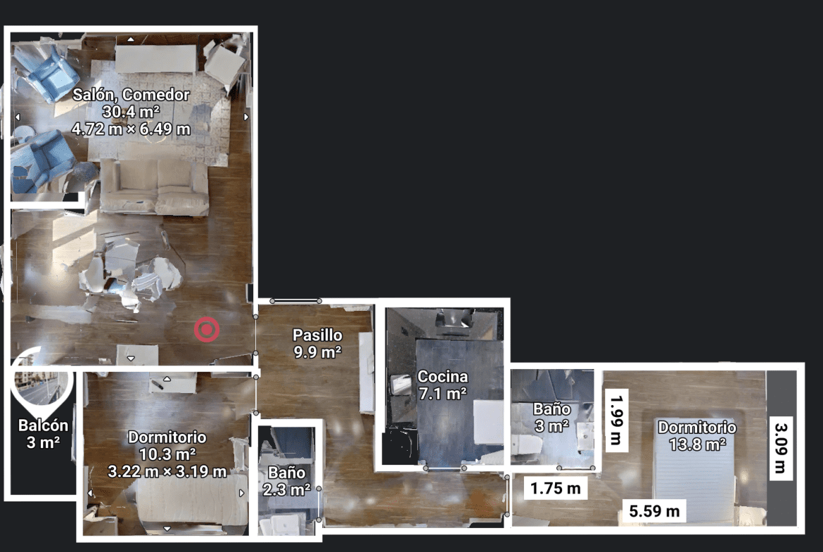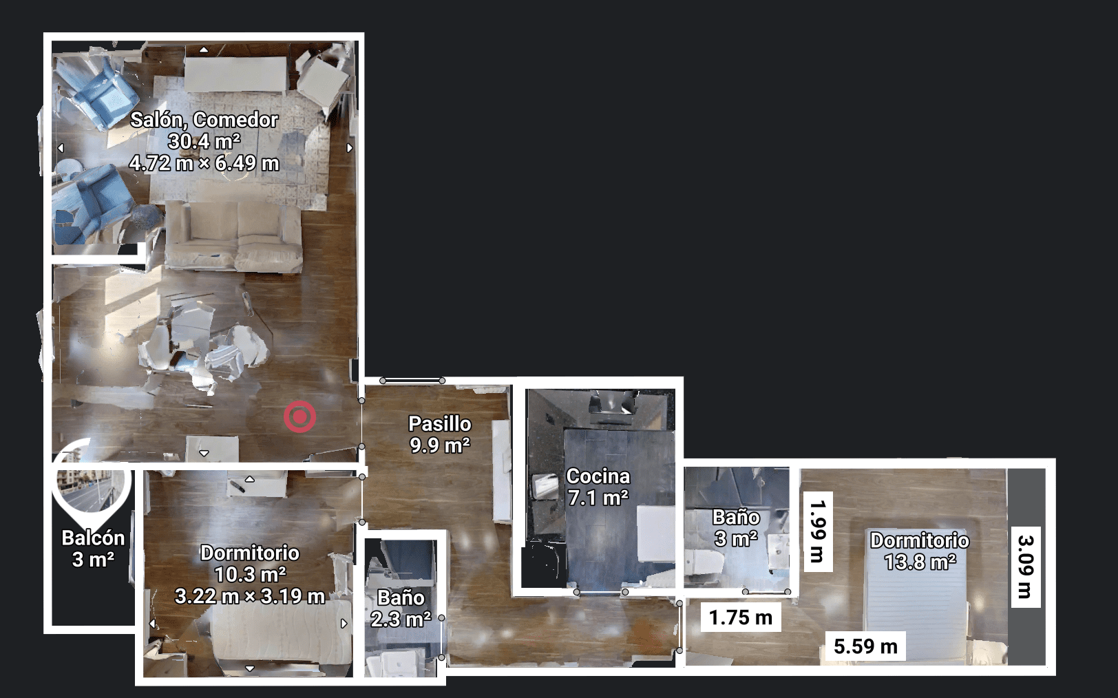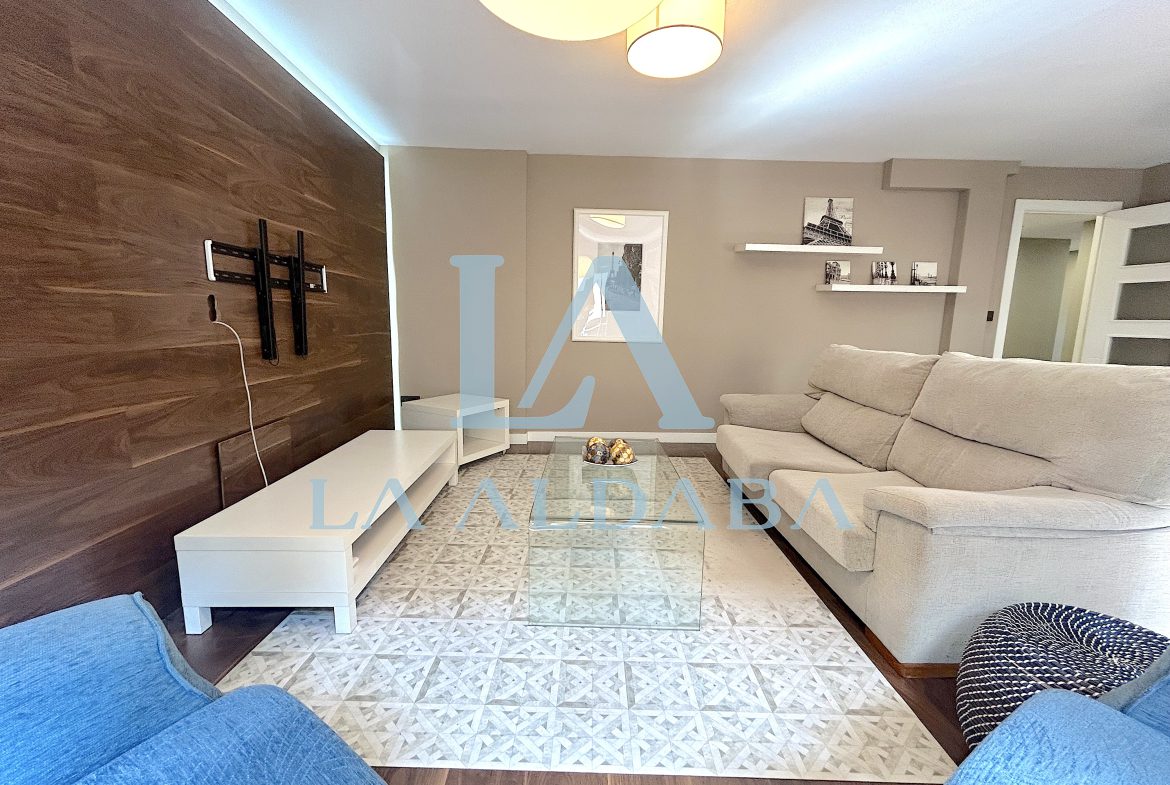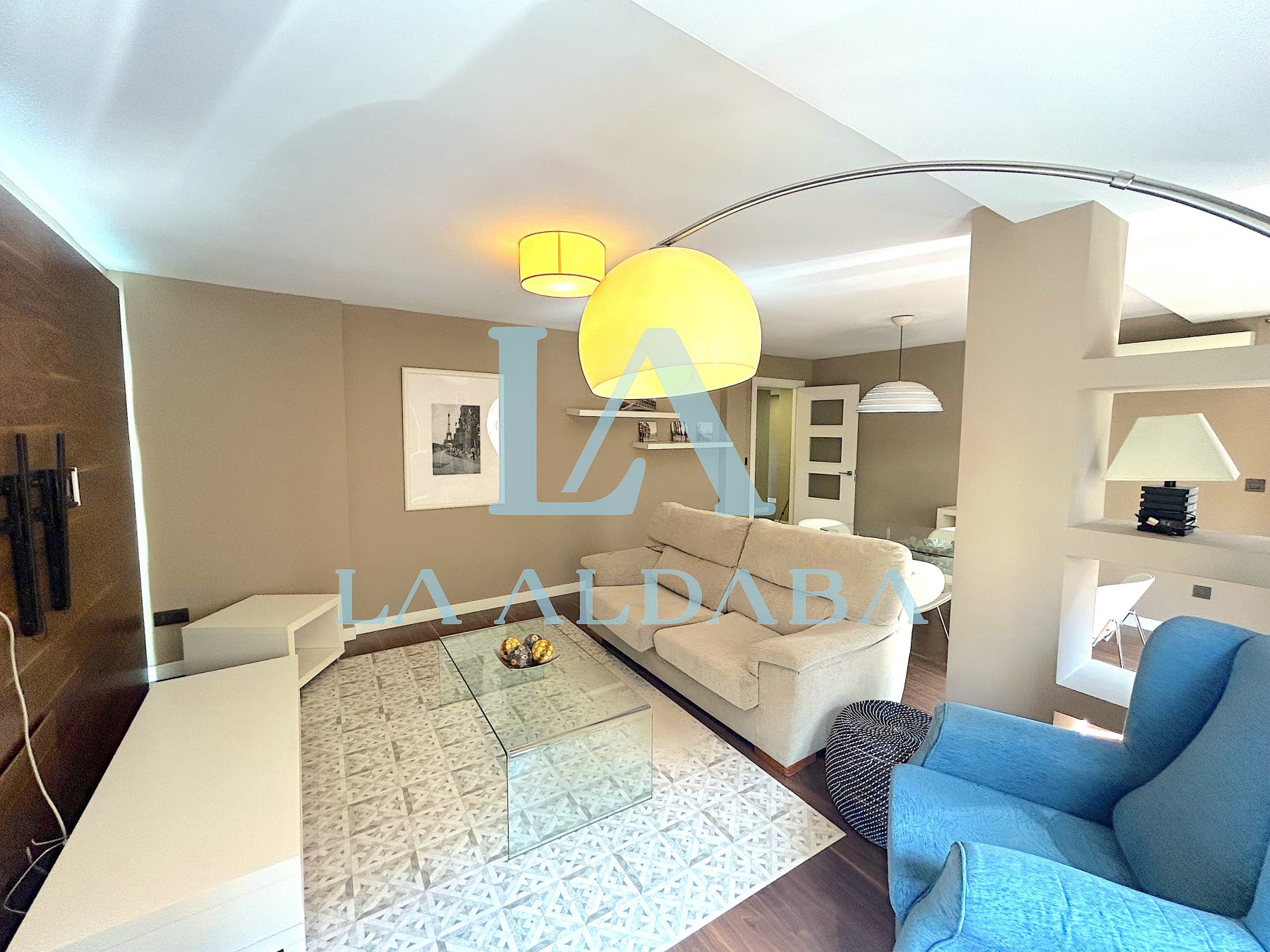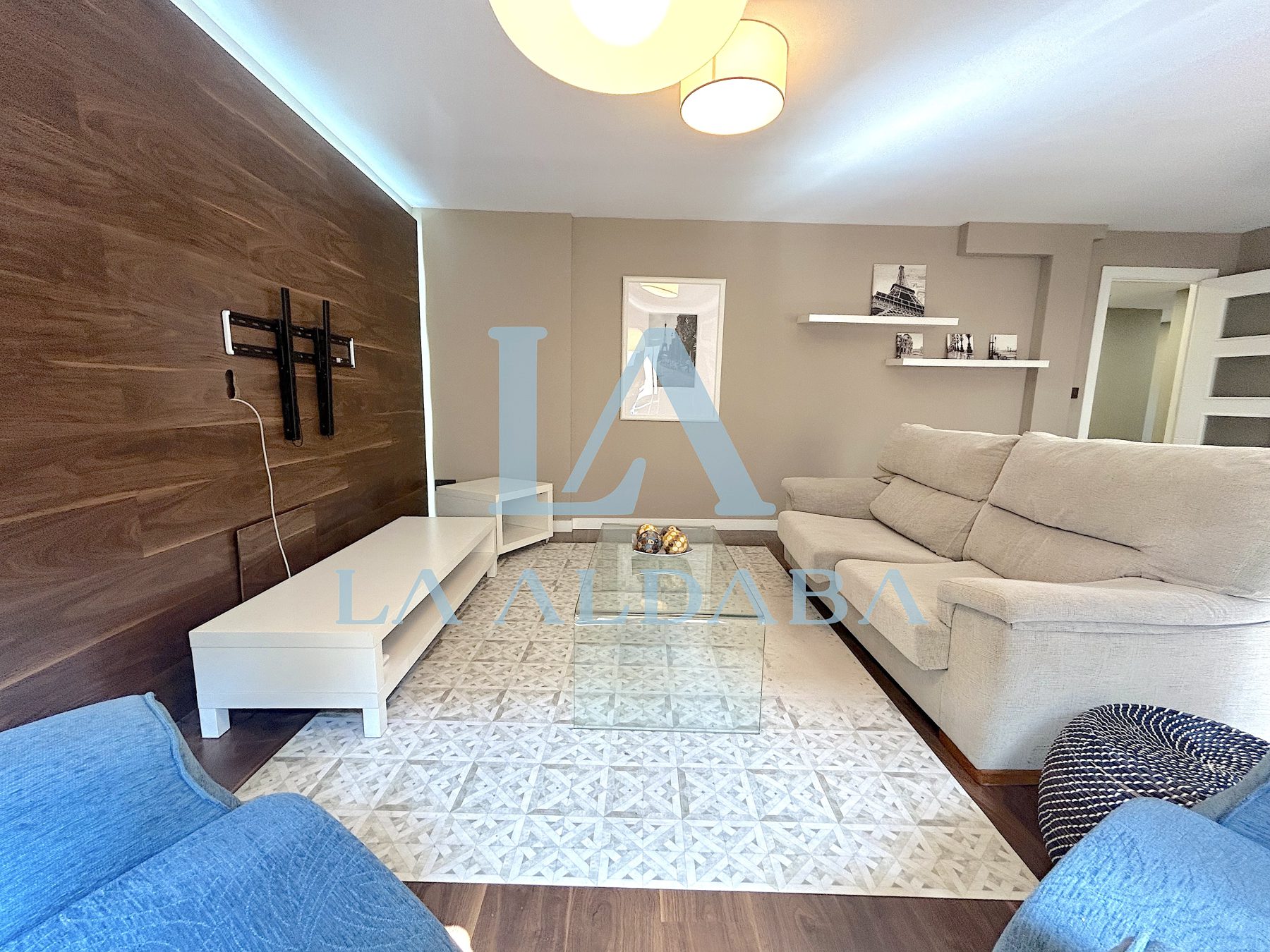 El piso se reformó íntegramente hace 4 años (electricidad, fontanería, suelos, baños, cocina, habitaciones, etc. ). Tiene un amplio salón-comedor exterior de 30 m2 con orientación oeste, dos ventanas y una puerta con salida al balcón. Cuenta con aire acondicionado marca Mitsubishi, una moderna estantería de pladur a modo de separación de estancias, suelo de tarima y revestimiento de pared con la propia tarima con retroiluminación en la zona del televisor y soporte para el mismo. Se entrega con el sofá, los muebles blancos y los cuadros.