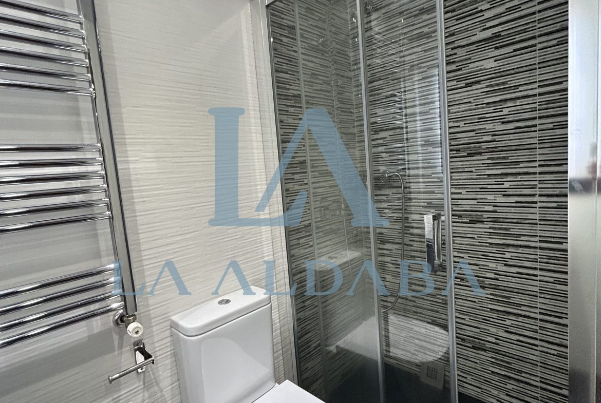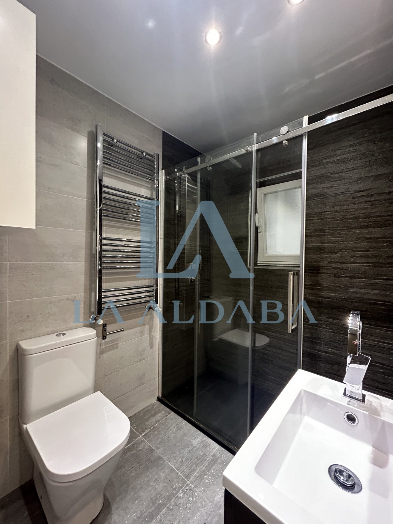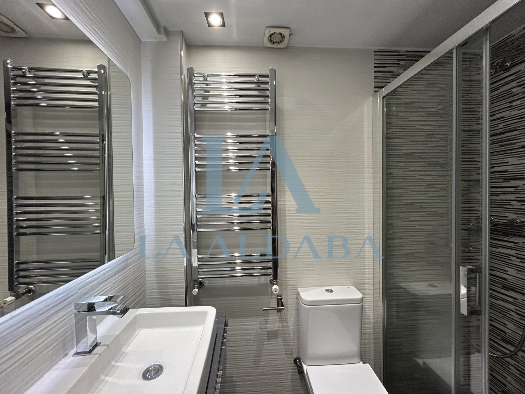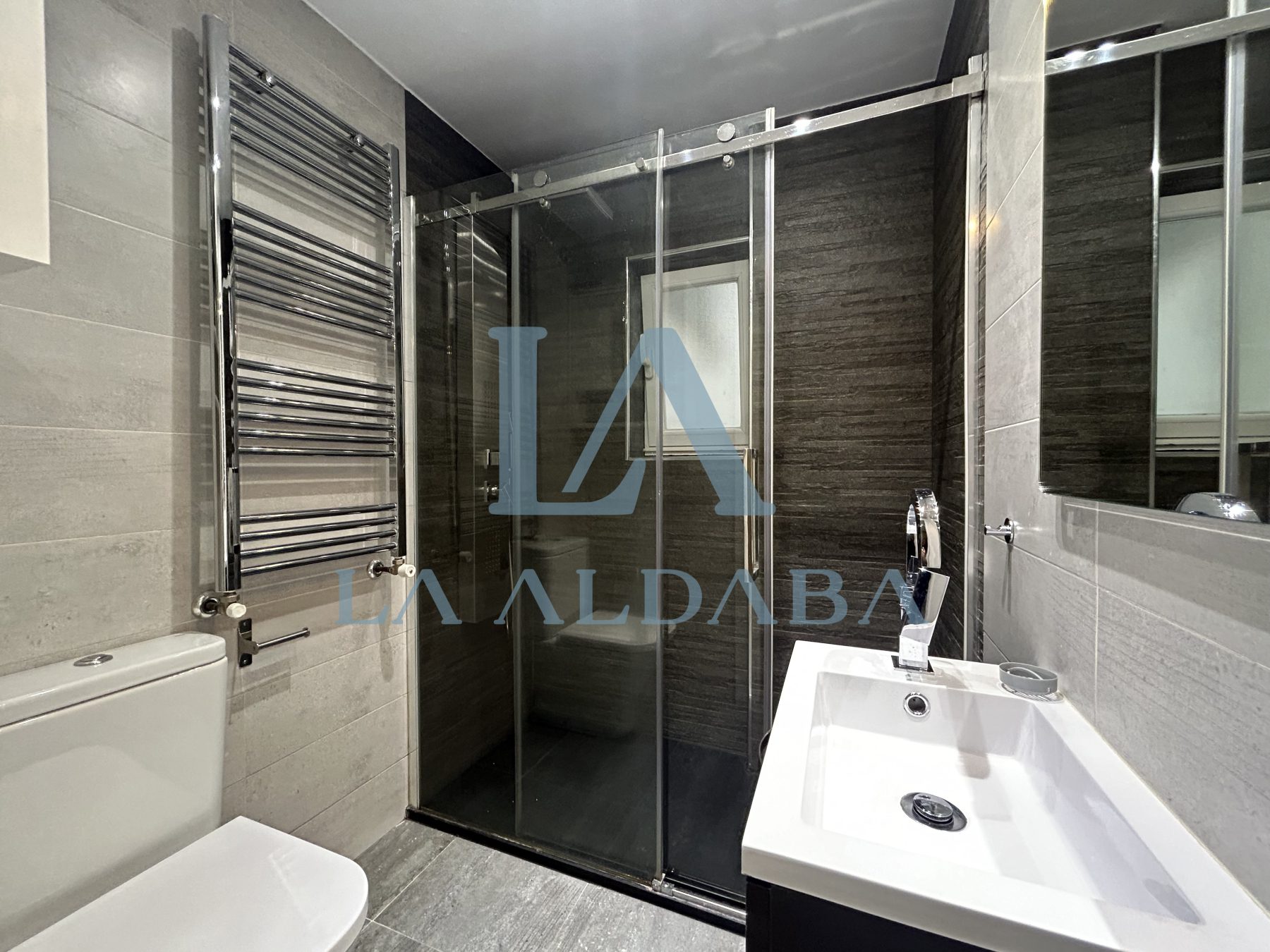 El baño principal está también reformado y cuenta con suelo de gres, otro gran plato de ducha con mampara de cristal, toallero eléctrico y espejo retroiluminado.