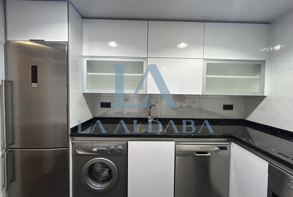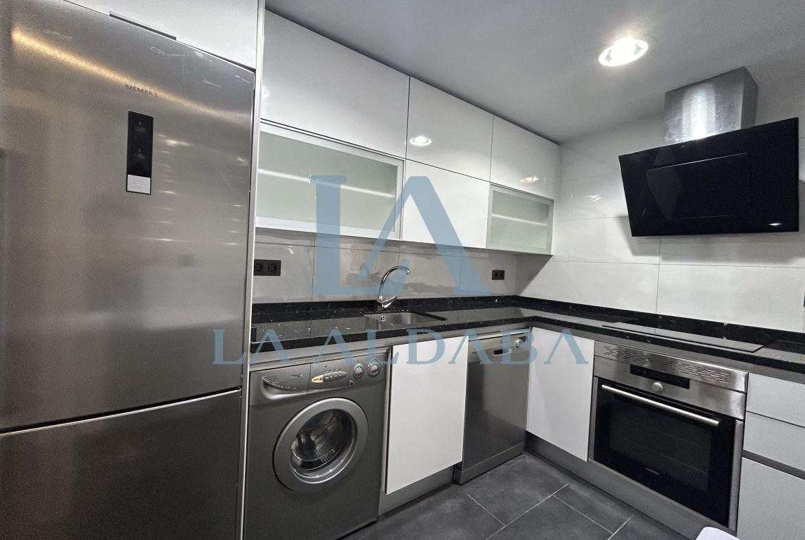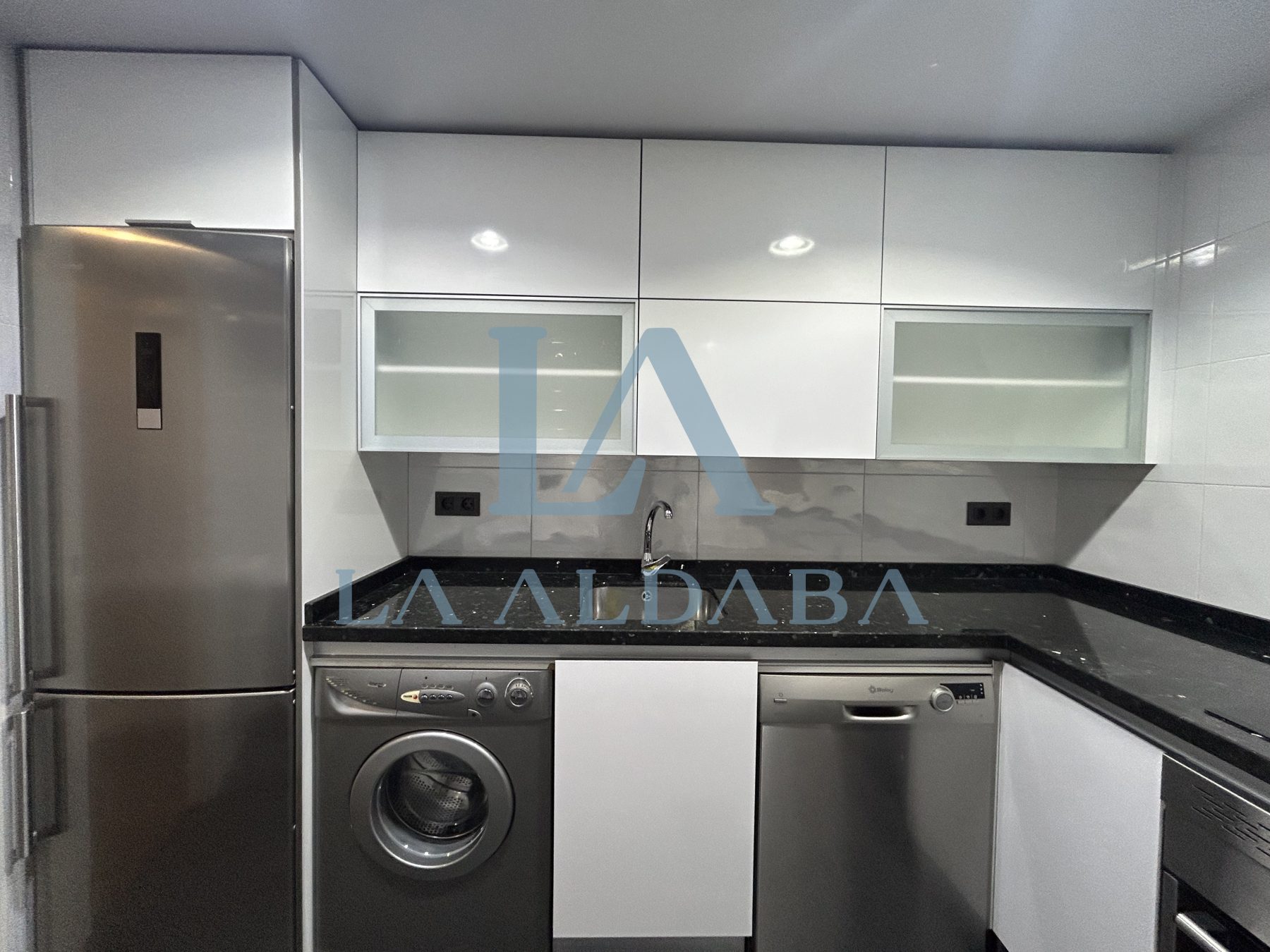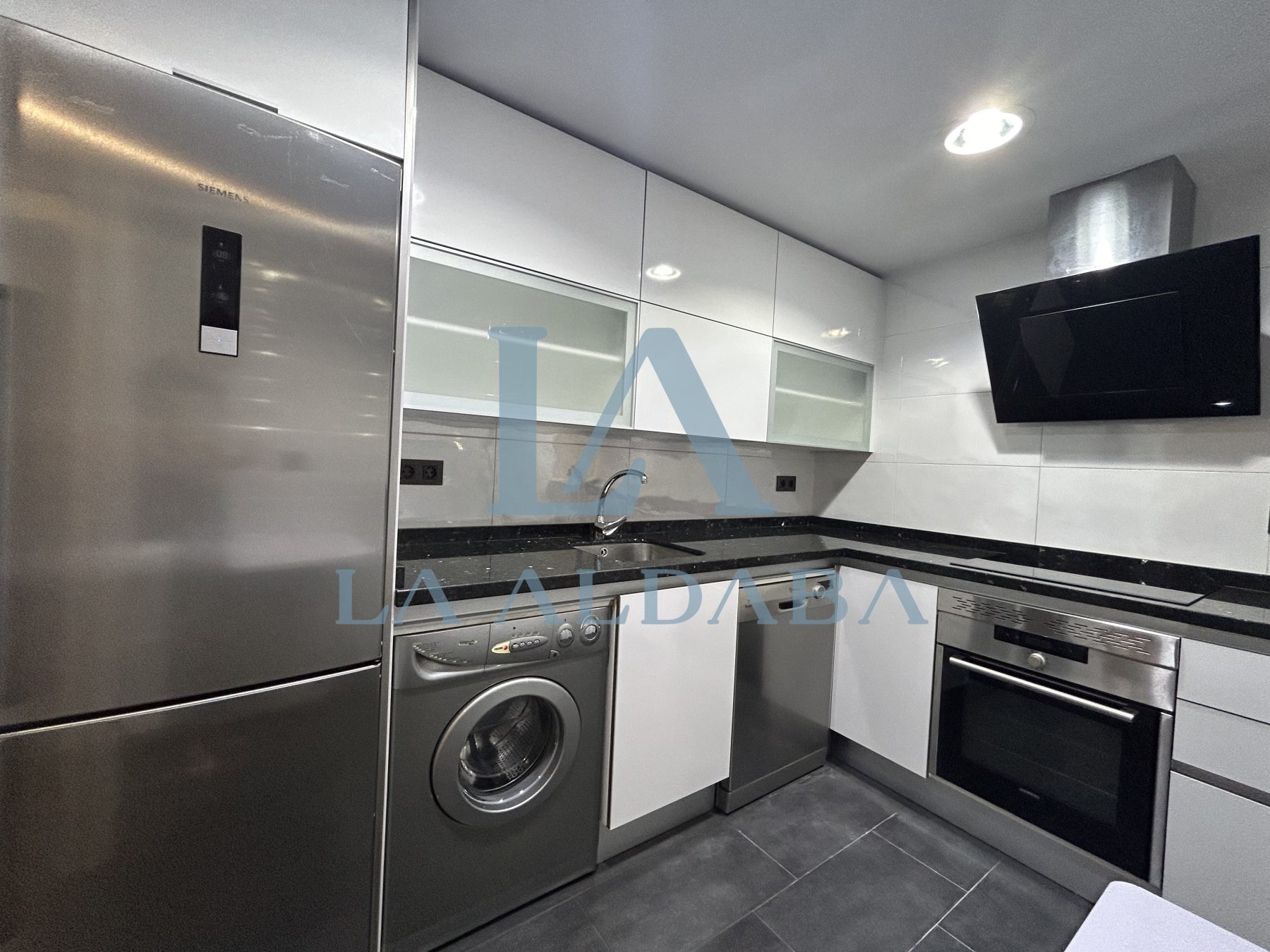 La amplia cocina, con ventana, totalmente reformada y amueblada tiene el suelo de gres, una mesa abatible, encimera de granito y electrodomésticos de primeras marcas: nevera y horno Siemens, lavadora Fagor, lavavajillas Balay, vitrocerámica y campana extractora inclinada.